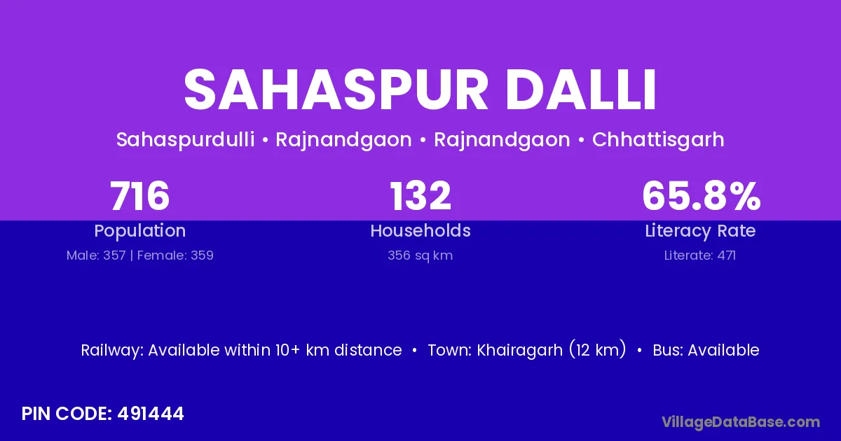 Khairagarh (12 km) is the nearest town to Sahaspur Dalli village for major economic activities and is located approximately 12 km away.