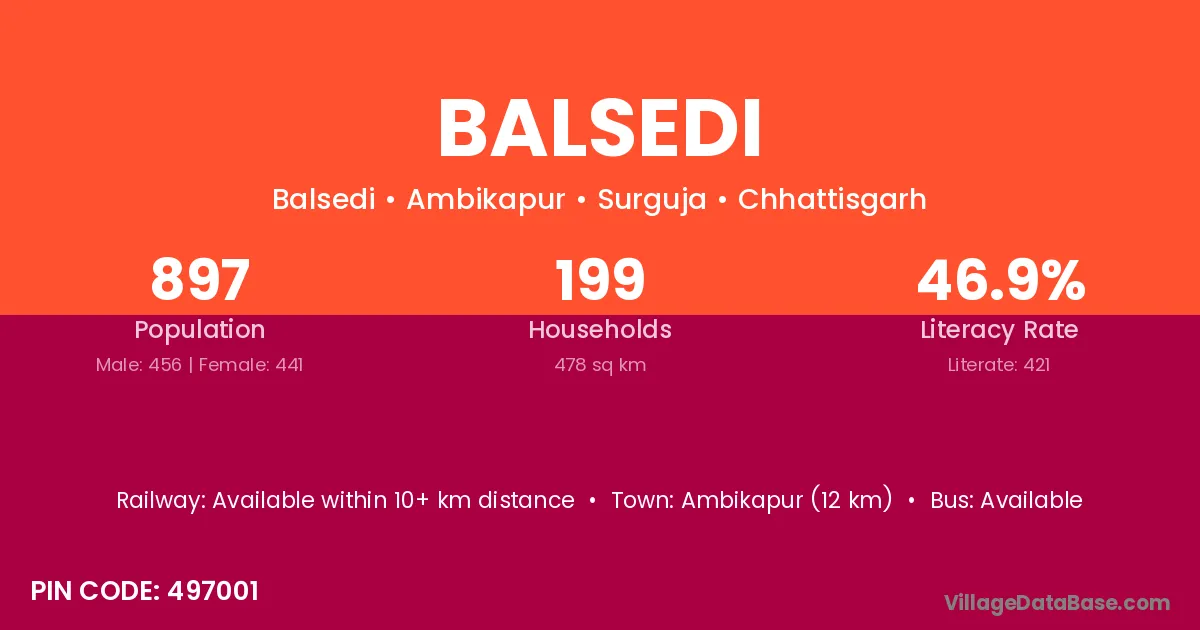 Ambikapur (12 km) is the nearest town to Balsedi village for major economic activities and is located approximately 12 km away.
