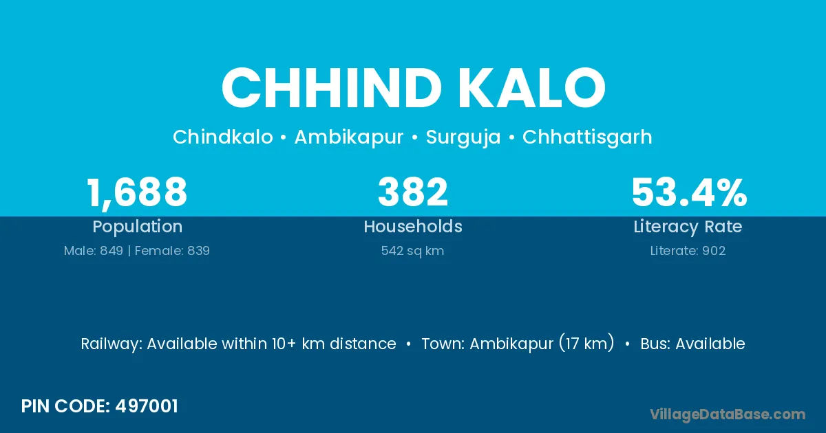 Ambikapur (17 km) is the nearest town to Chhind Kalo village for major economic activities and is located approximately 17 km away.