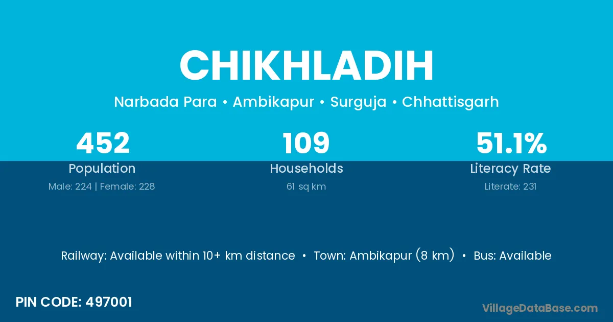 Chikhladih village has a total population of 452 people, of which 224 are males and 228 are females.