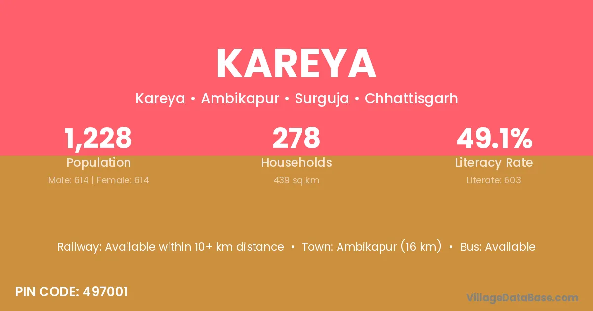 Ambikapur (16 km) is the nearest town to Kareya village for major economic activities and is located approximately 16 km away.