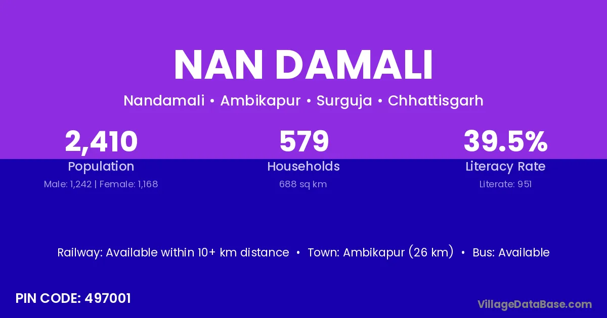 Ambikapur (26 km) is the nearest town to Nan Damali village for major economic activities and is located approximately 26 km away.