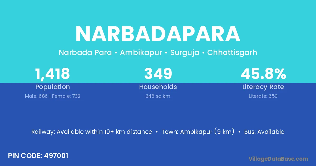 Ambikapur (9 km) is the nearest town to Narbadapara village for major economic activities and is located approximately 9 km away.