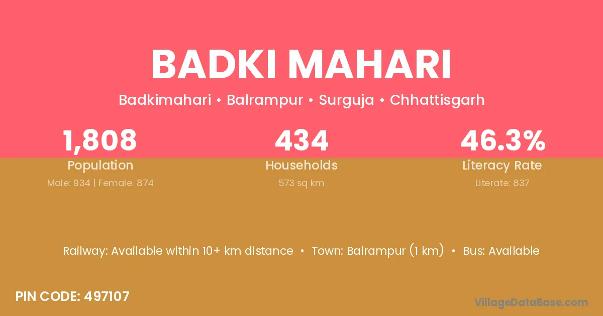 Balrampur (1 km) is the nearest town to Badki Mahari village for major economic activities and is located approximately 1 km away.
