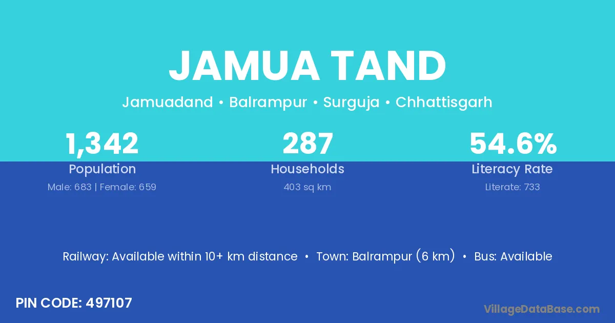 Balrampur (6 km) is the nearest town to Jamua Tand village for major economic activities and is located approximately 6 km away.