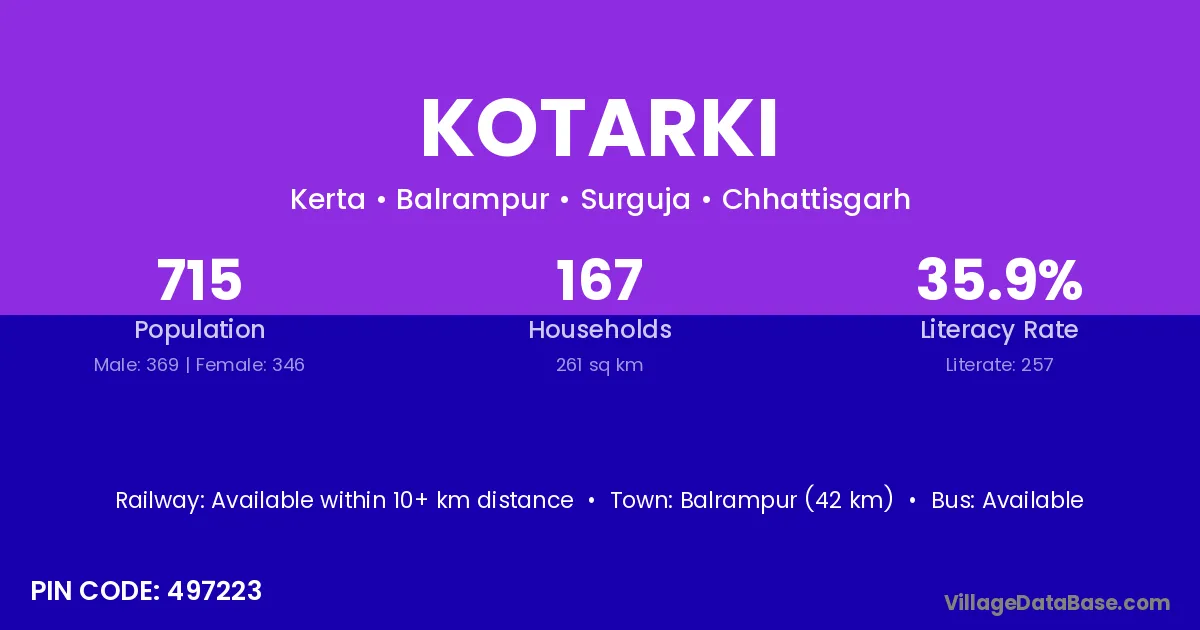 Balrampur (42 km) is the nearest town to Kotarki village for major economic activities and is located approximately 42 km away.