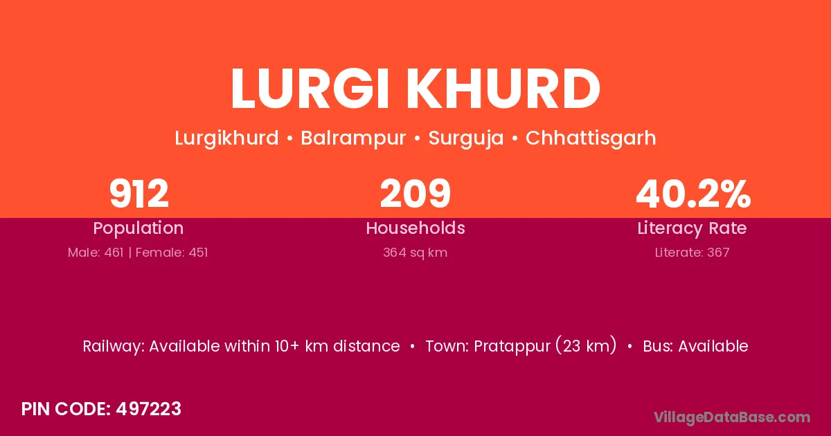 Pratappur (23 km) is the nearest town to Lurgi Khurd village for major economic activities and is located approximately 23 km away.