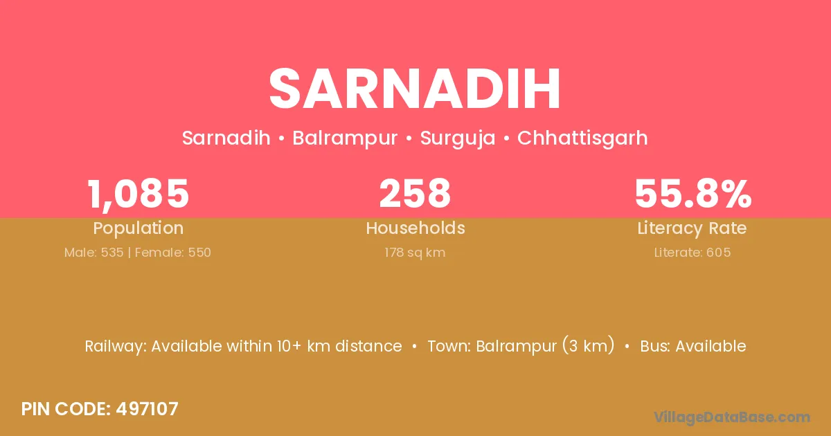 Balrampur (3 km) is the nearest town to Sarnadih village for major economic activities and is located approximately 3 km away.