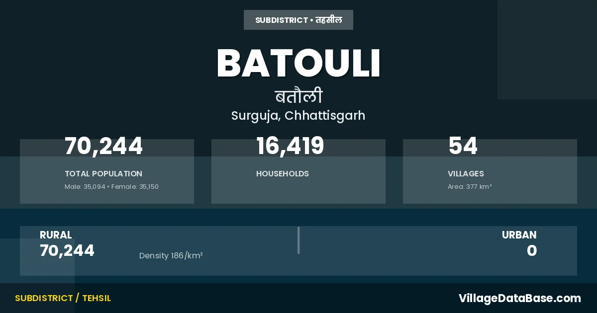 Batouli is a town and Tehsil in the Surguja district of the Chhattisgarh. In India, a Tehsil is a subdivision of a district responsible for the administration and revenue collection of a specific area within the district. Tehsils play a crucial role in the local governance structure, contributing significantly to the development and administration of their communities.