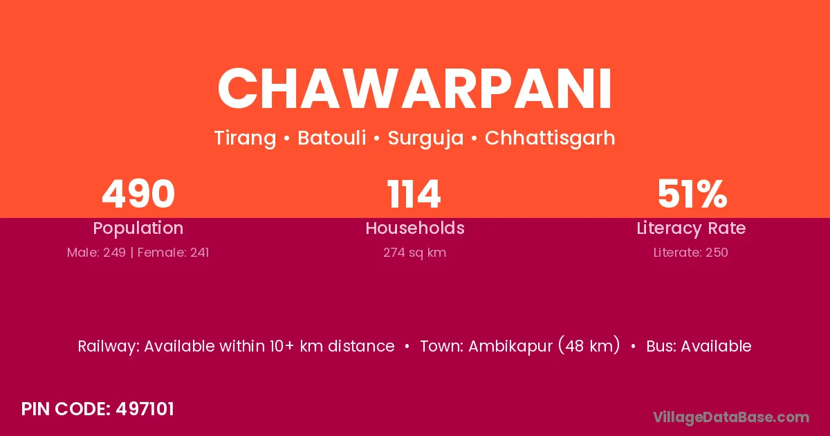 Chawarpani village has a total population of 490 people, of which 249 are males and 241 are females.