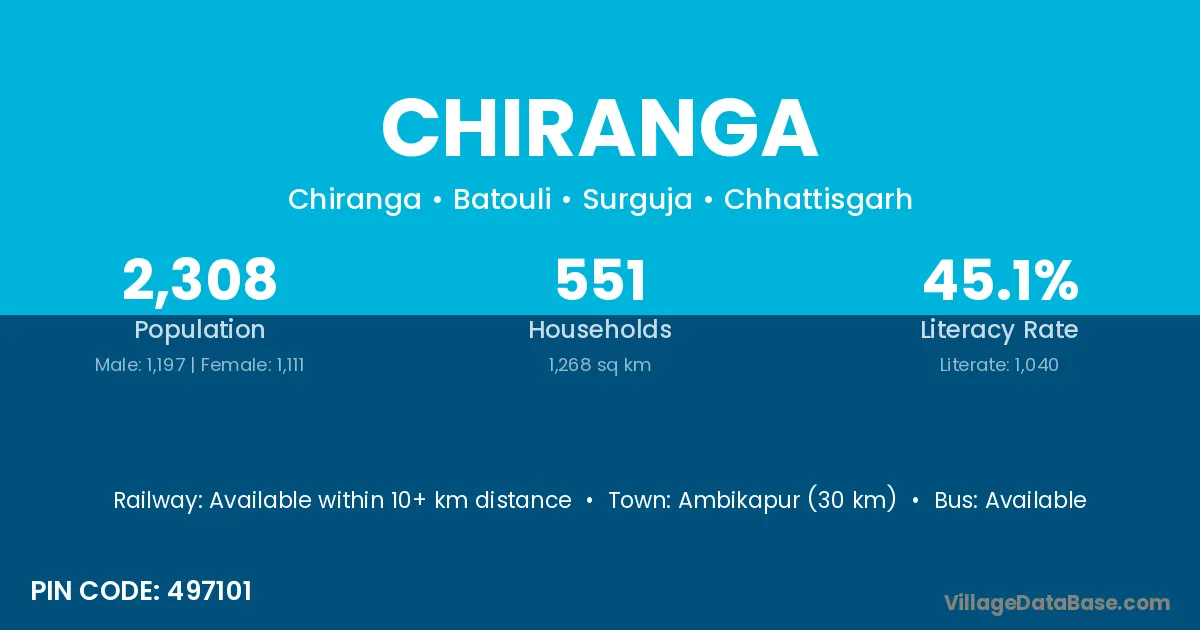 Ambikapur (30 km) is the nearest town to Chiranga village for major economic activities and is located approximately 30 km away.
