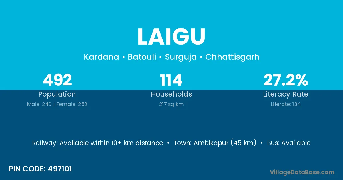 Ambikapur (45 km) is the nearest town to Laigu village for major economic activities and is located approximately 45 km away.