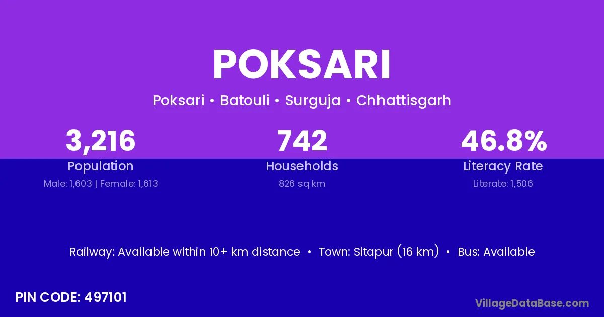 Poksari village has a total population of 3,216 people, of which 1,603 are males and 1,613 are females.