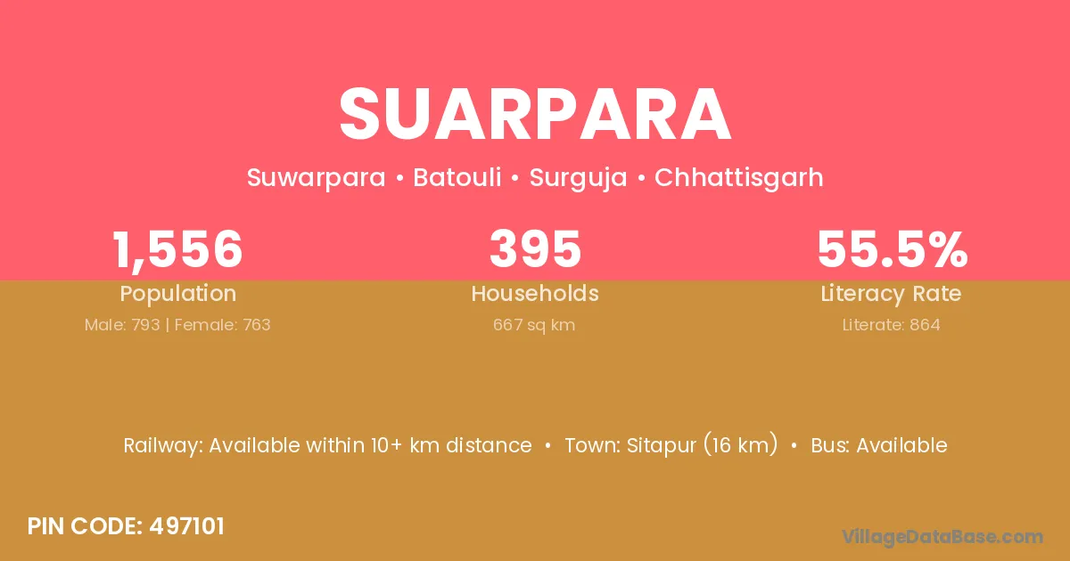 Suarpara village has a total population of 1,556 people, of which 793 are males and 763 are females.