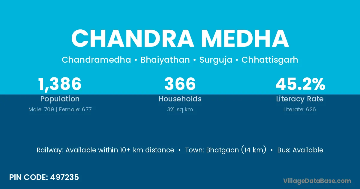 Chandra Medha village has a total population of 1,386 people, of which 709 are males and 677 are females.