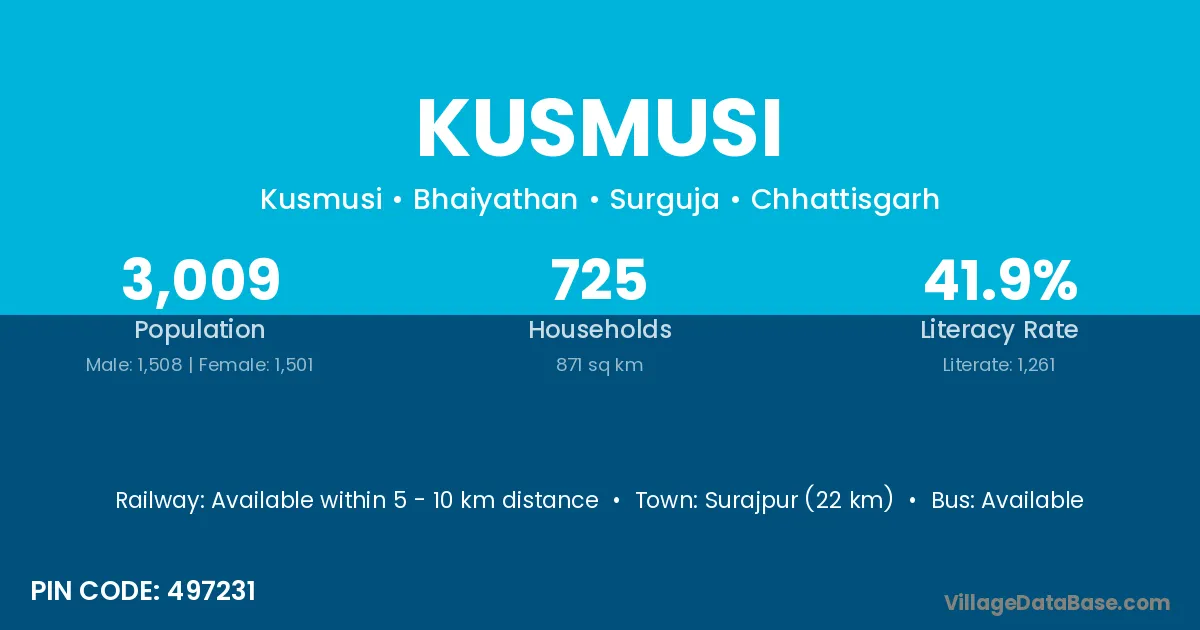 Surajpur (22 km) is the nearest town to Kusmusi village for major economic activities and is located approximately 22 km away.