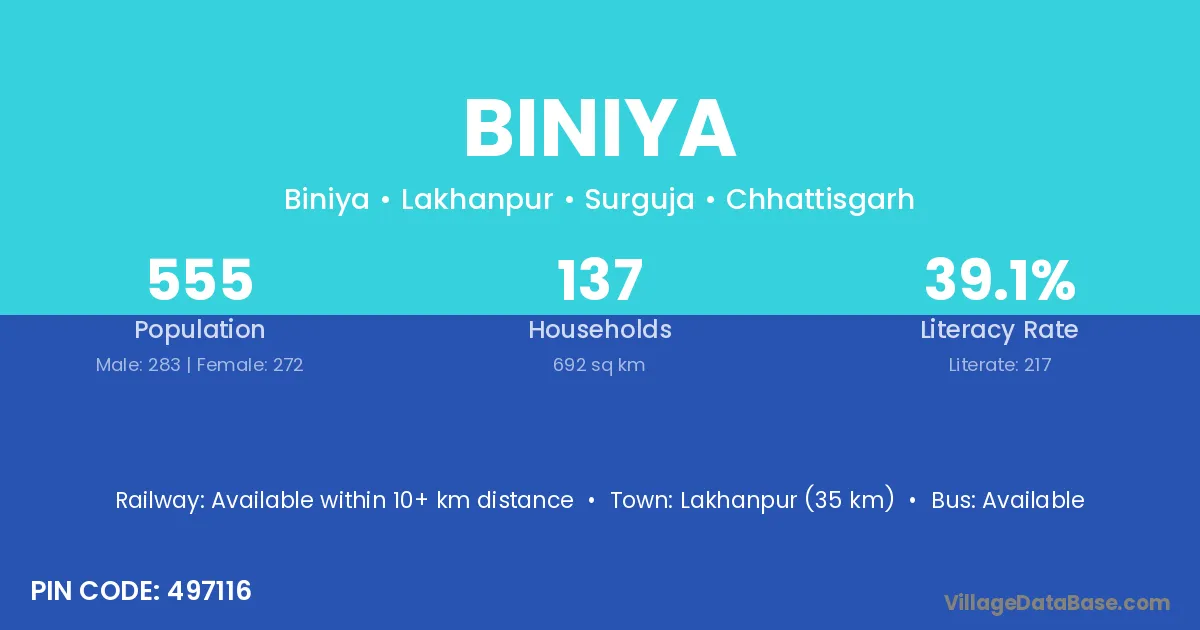 Biniya village is located in the Lakhanpur Tehsil of the Surguja district in Chhattisgarh .