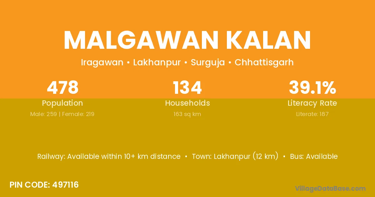 Malgawan Kalan village has a total population of 478 people, of which 259 are males and 219 are females.