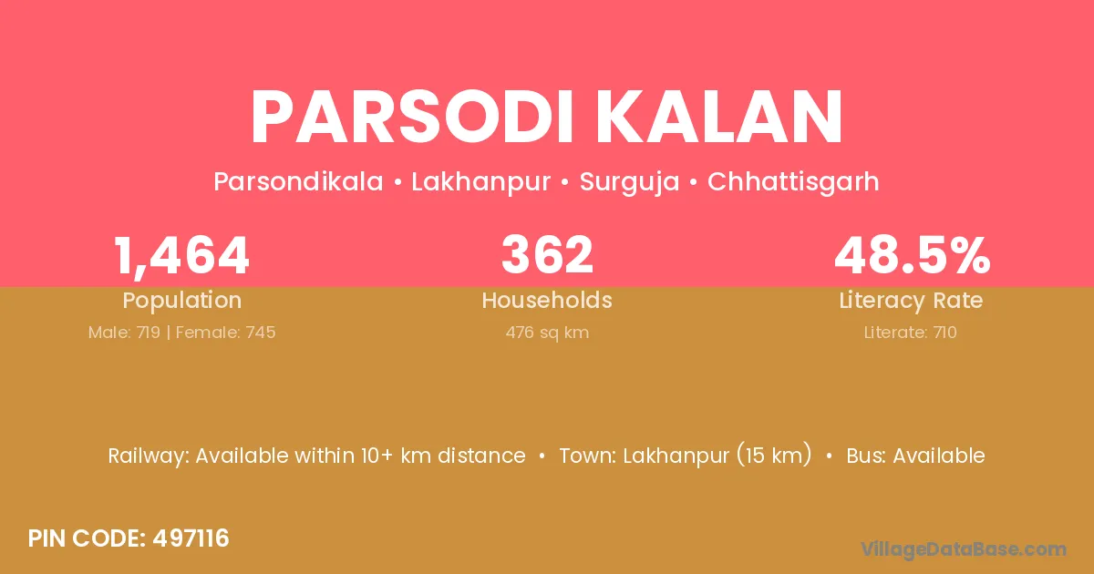 Parsodi Kalan village is located in the Lakhanpur Tehsil of the Surguja district in Chhattisgarh .