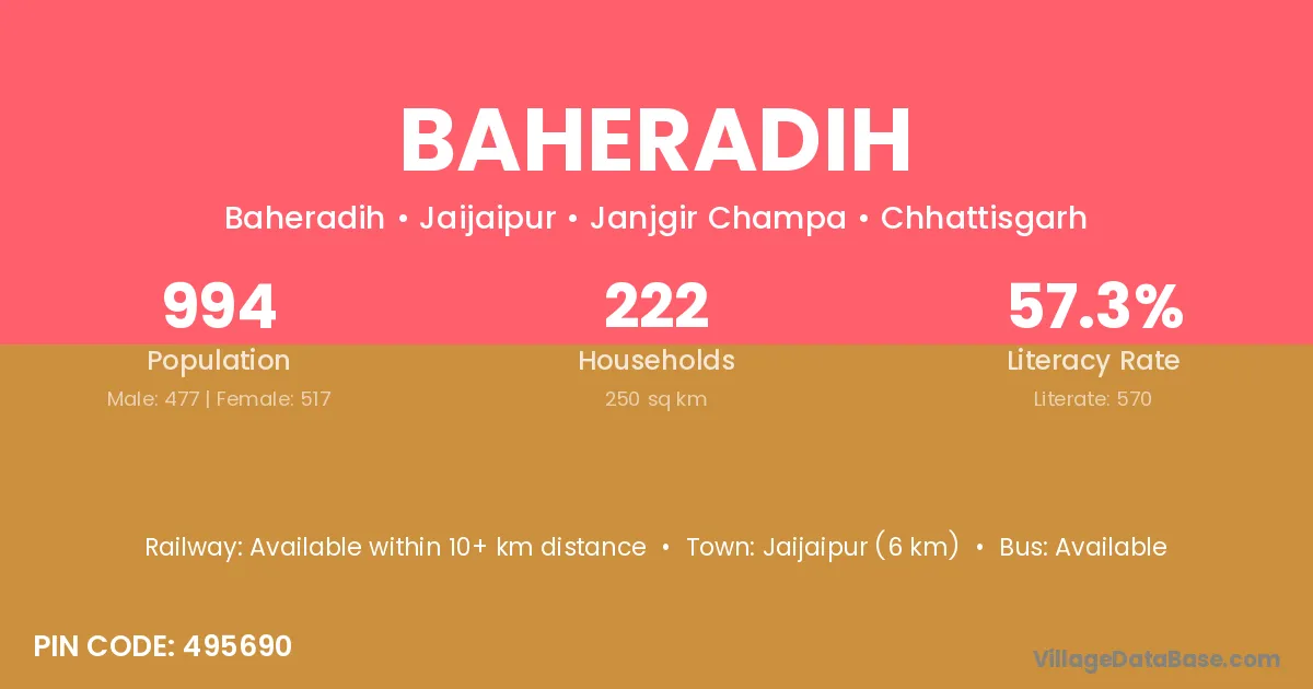 Ambikapur (30 km) is the nearest town to Baheradih village for major economic activities and is located approximately 30 km away.