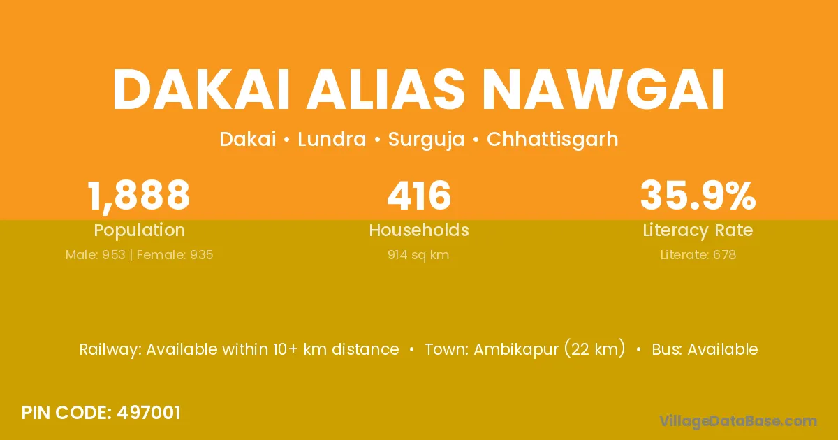 Ambikapur (22 km) is the nearest town to Dakai Alias Nawgai village for major economic activities and is located approximately 22 km away.