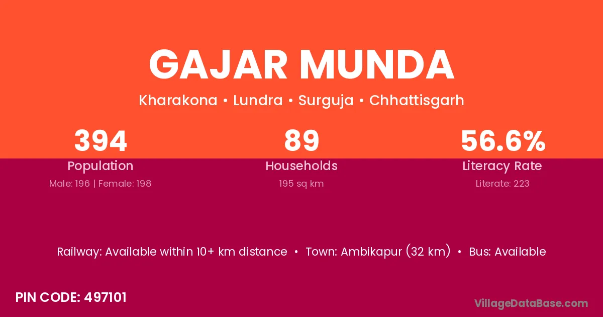 Ambikapur (32 km) is the nearest town to Gajar Munda village for major economic activities and is located approximately 32 km away.