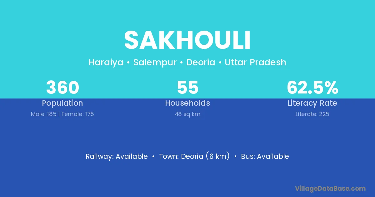 The literacy rate of Sakhouli village is 44.41%. Male literacy stands at 53.54% and female literacy at 35.20%.