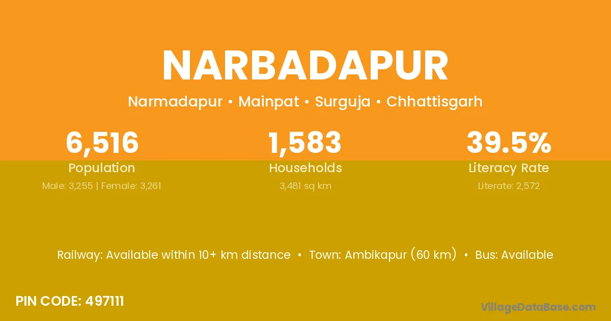 Ambikapur (60 km) is the nearest town to Narbadapur village for major economic activities and is located approximately 60 km away.
