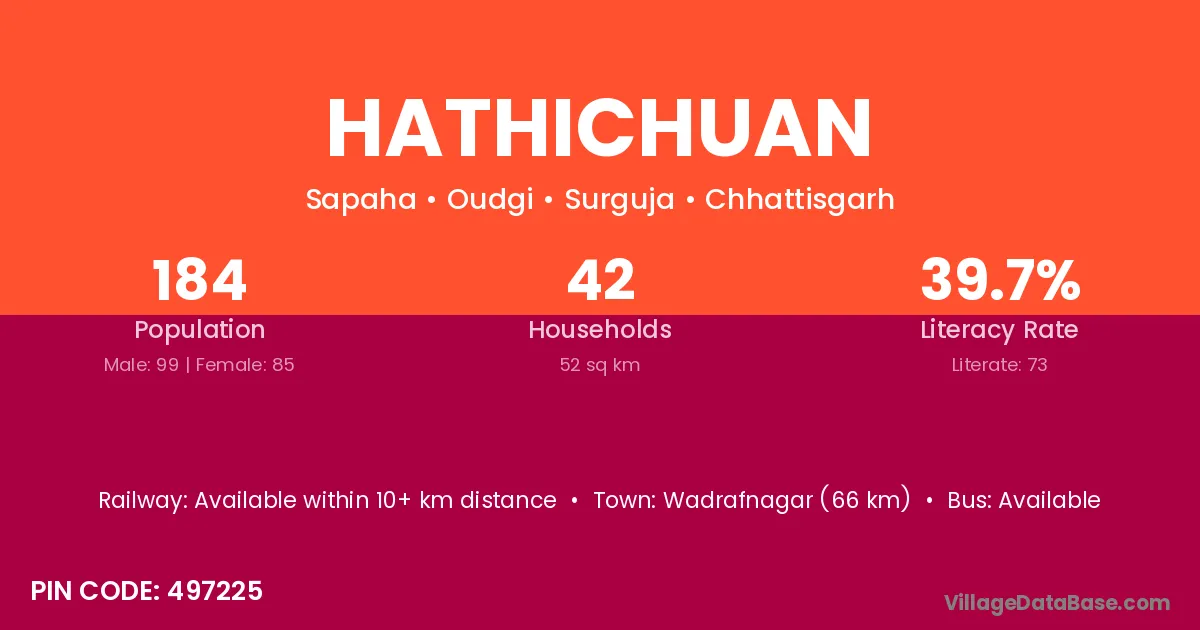 Wadrafnagar (66 km) is the nearest town to Hathichuan village for major economic activities and is located approximately 66 km away.