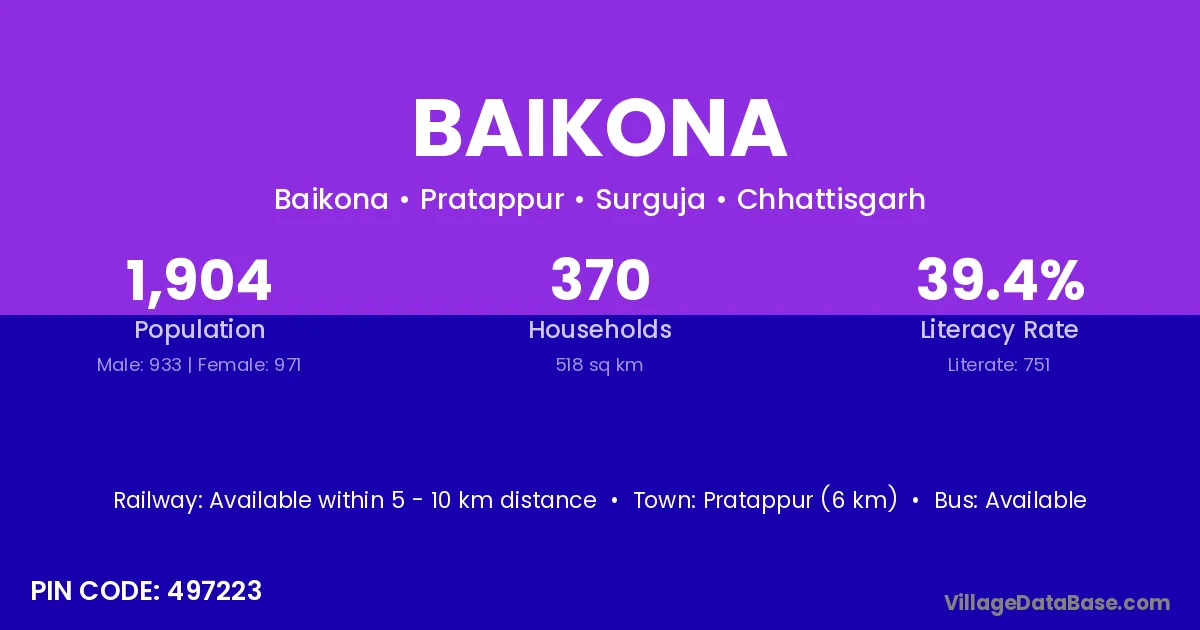 Pratappur (6 km) is the nearest town to Baikona village for major economic activities and is located approximately 6 km away.
