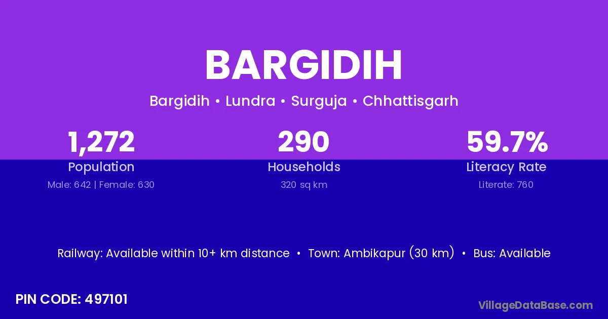 Pratappur (37 km) is the nearest town to Bargidih village for major economic activities and is located approximately 37 km away.