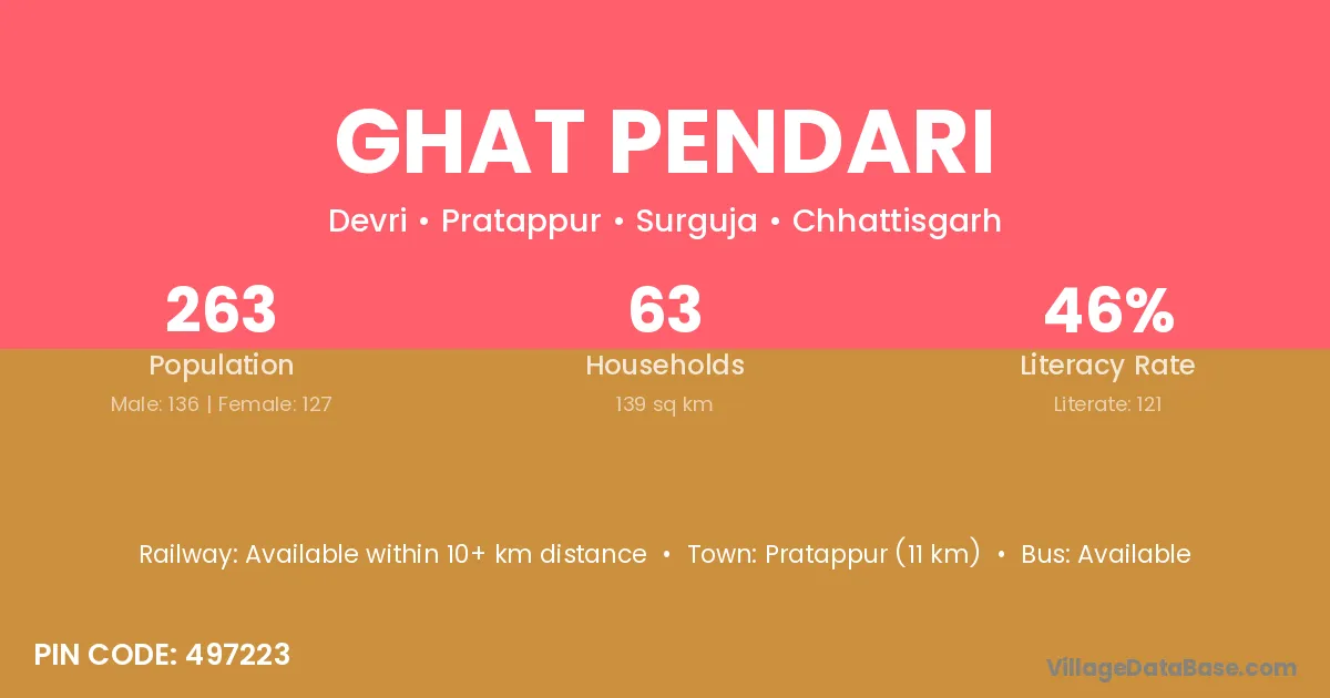 Pratappur (11 km) is the nearest town to Ghat Pendari village for major economic activities and is located approximately 11 km away.