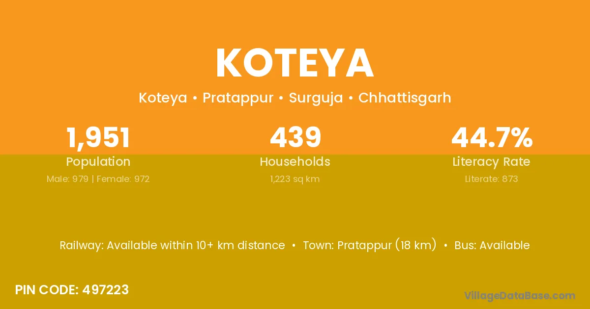 Pratappur (18 km) is the nearest town to Koteya village for major economic activities and is located approximately 18 km away.