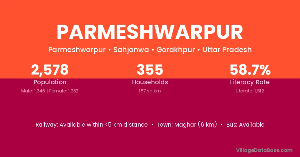 Pratappur (15 km) is the nearest town to Parmeshwarpur village for major economic activities and is located approximately 15 km away.
