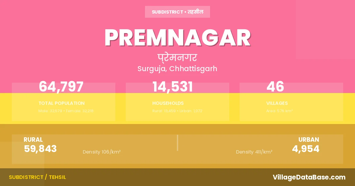 Premnagar is a town and Tehsil in the Surguja district of the Chhattisgarh. In India, a Tehsil is a subdivision of a district responsible for the administration and revenue collection of a specific area within the district. Tehsils play a crucial role in the local governance structure, contributing significantly to the development and administration of their communities.