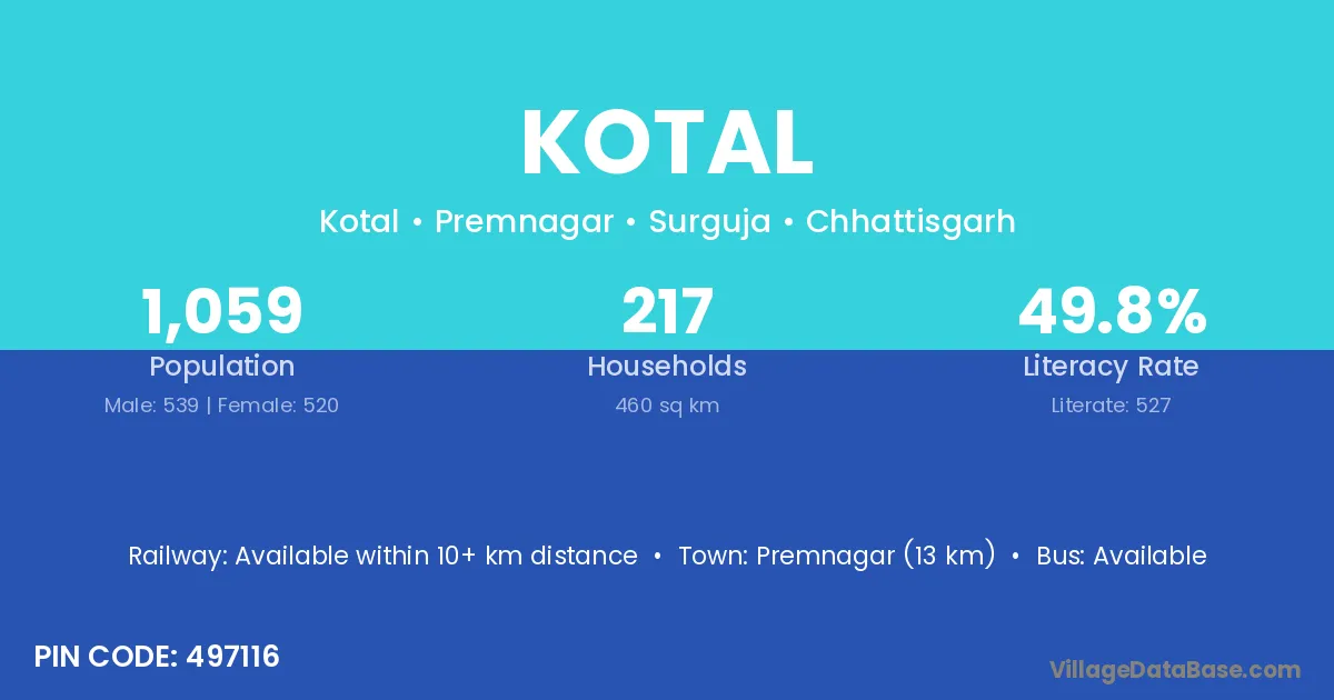 Premnagar (13 km) is the nearest town to Kotal village for major economic activities and is located approximately 13 km away.