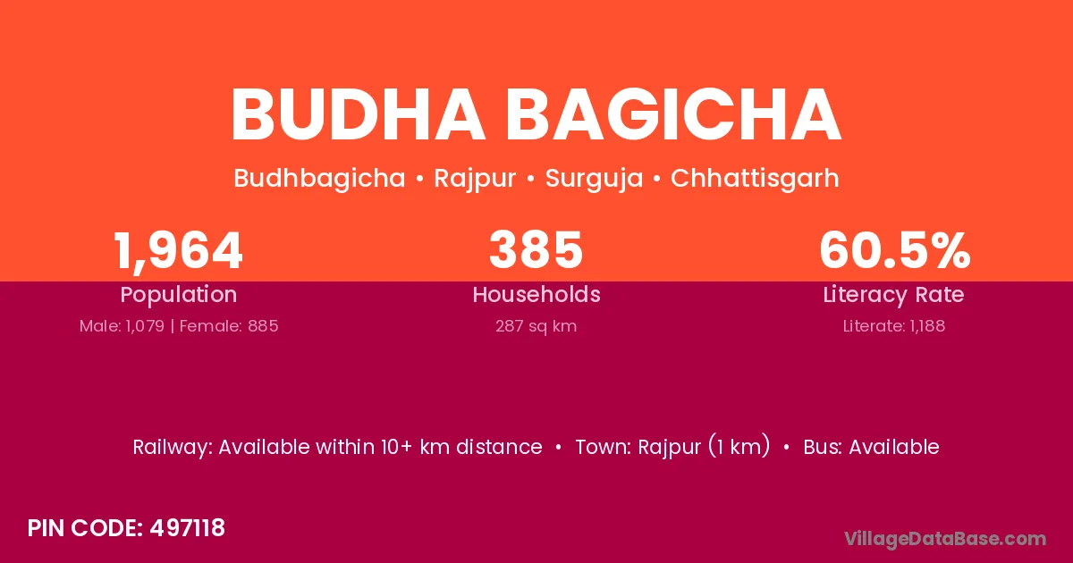 Rajpur (1 km) is the nearest town to Budha Bagicha village for major economic activities and is located approximately 1 km away.