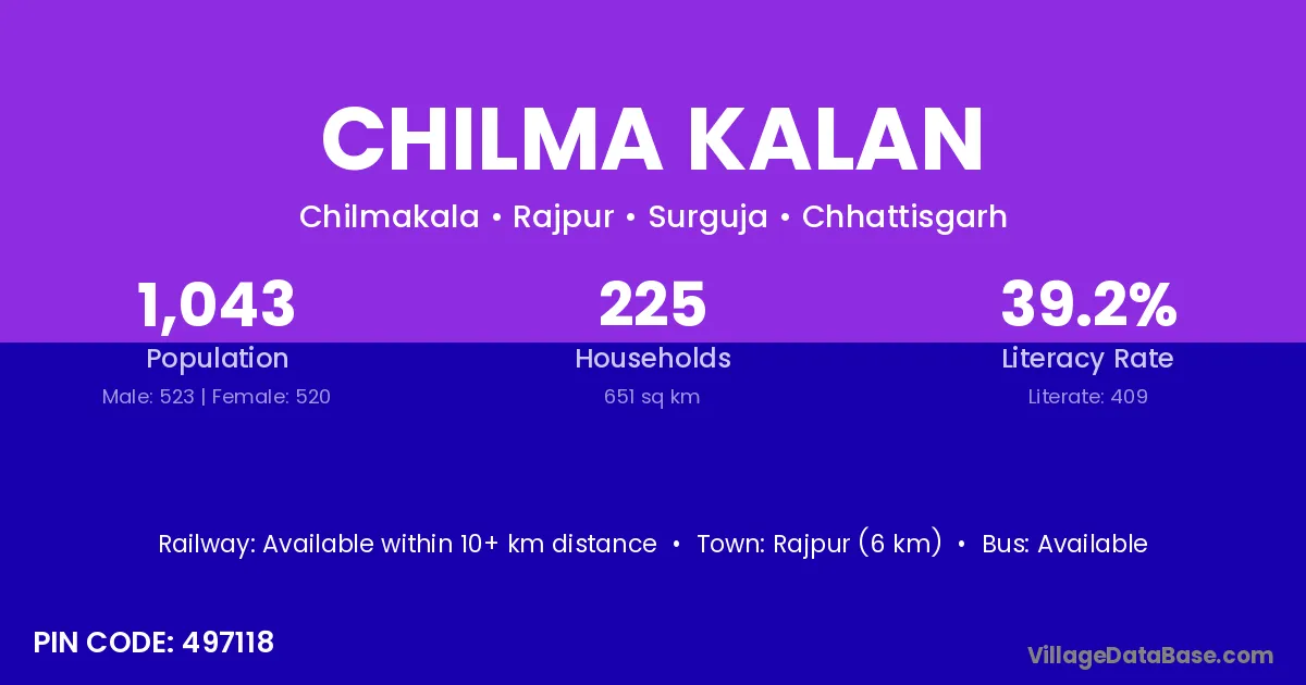 Chilma Kalan village has a total population of 1,043 people, of which 523 are males and 520 are females.