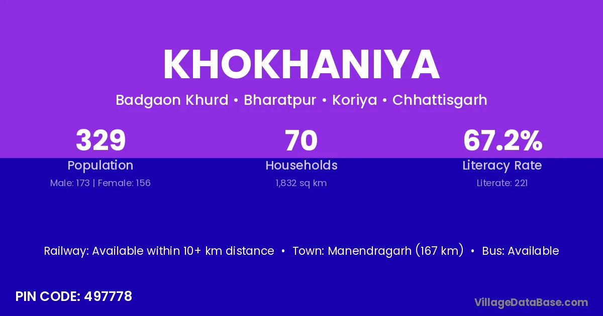 According to Census 2011 information, the village code of Khokhaniya village is 497001.