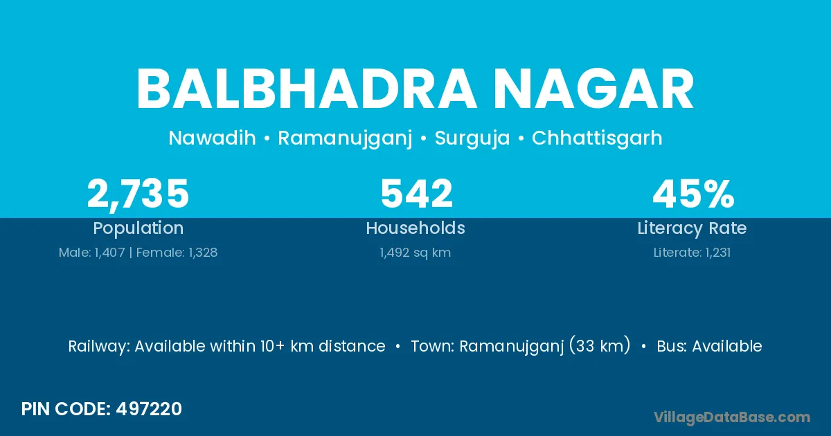Ramanujganj (33 km) is the nearest town to Balbhadra Nagar village for major economic activities and is located approximately 33 km away.