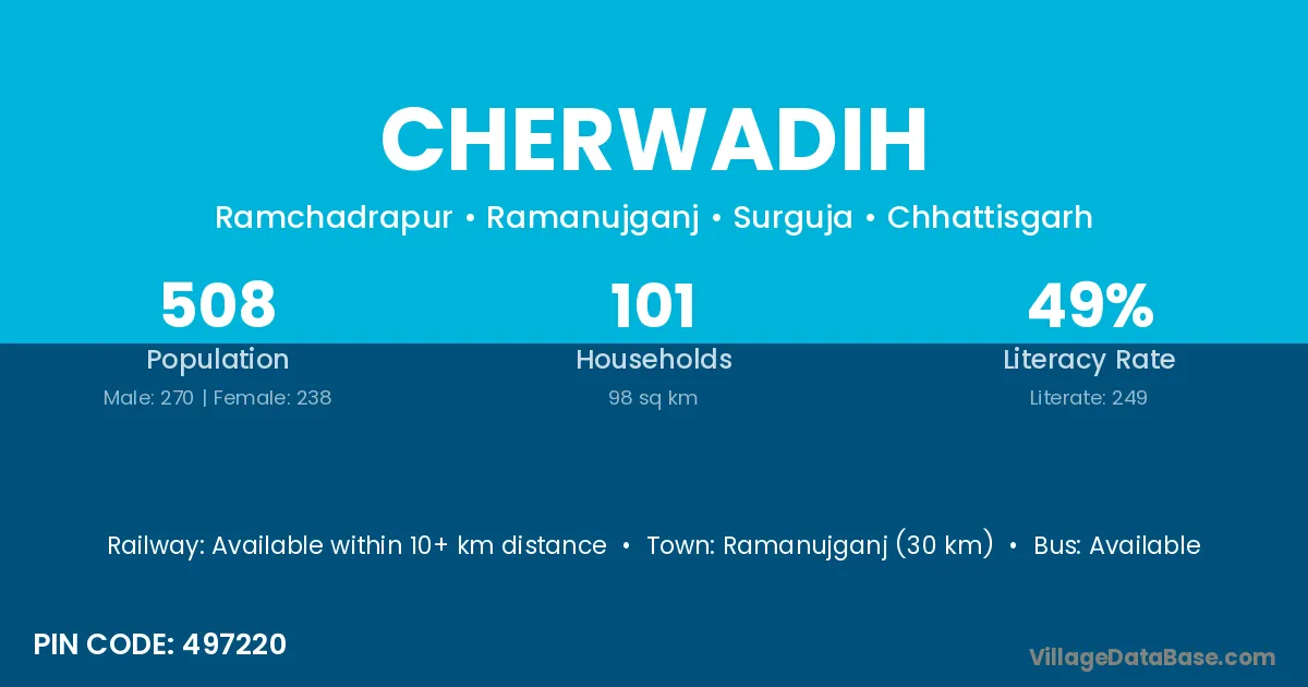 Ramanujganj (30 km) is the nearest town to Cherwadih village for major economic activities and is located approximately 30 km away.