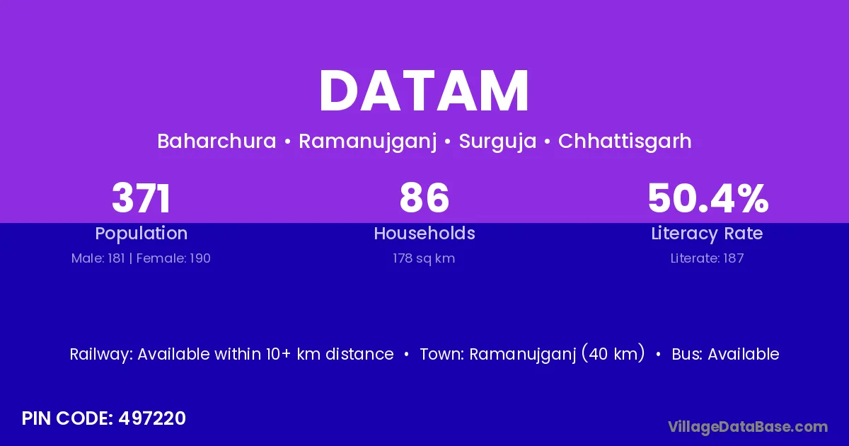 Ramanujganj (40 km) is the nearest town to Datam village for major economic activities and is located approximately 40 km away.