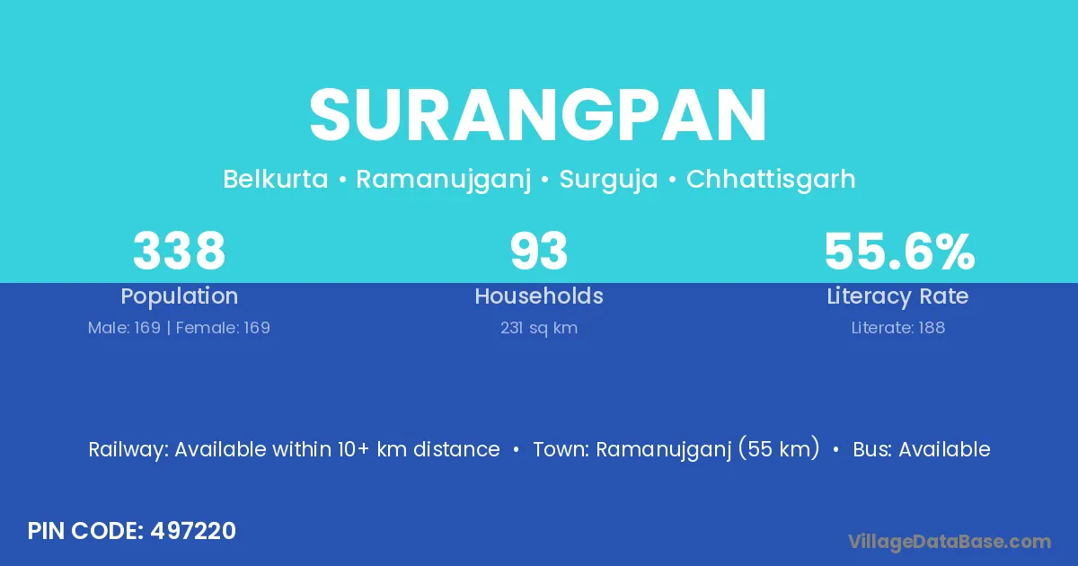 Ramanujganj (55 km) is the nearest town to Surangpan village for major economic activities and is located approximately 55 km away.
