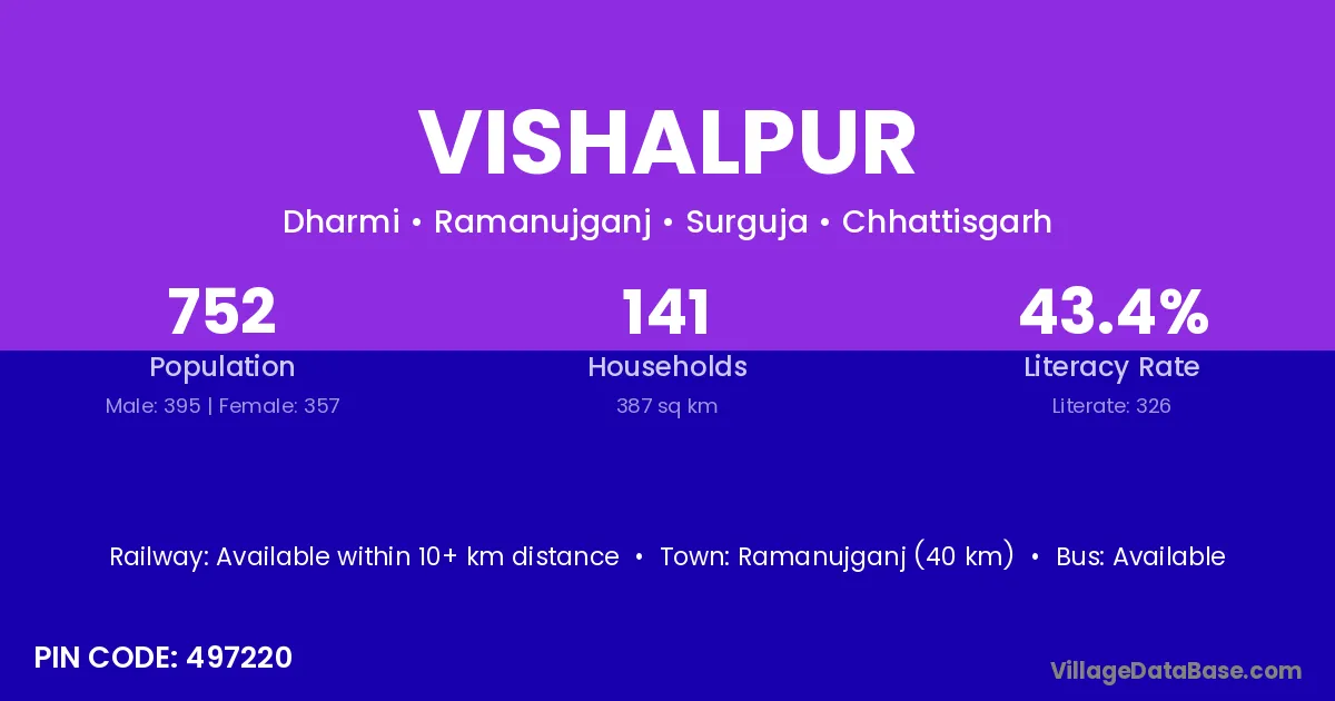 Ramanujganj (40 km) is the nearest town to Vishalpur village for major economic activities and is located approximately 40 km away.