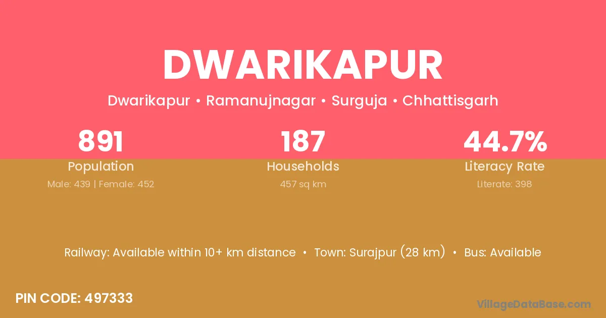 Surajpur (28 km) is the nearest town to Dwarikapur village for major economic activities and is located approximately 28 km away.