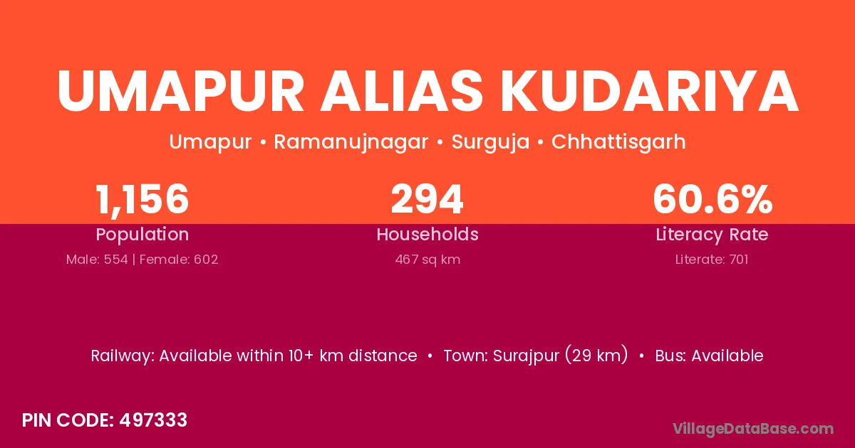 Umapur Alias Kudariya village has a total population of 1,156 people, of which 554 are males and 602 are females.