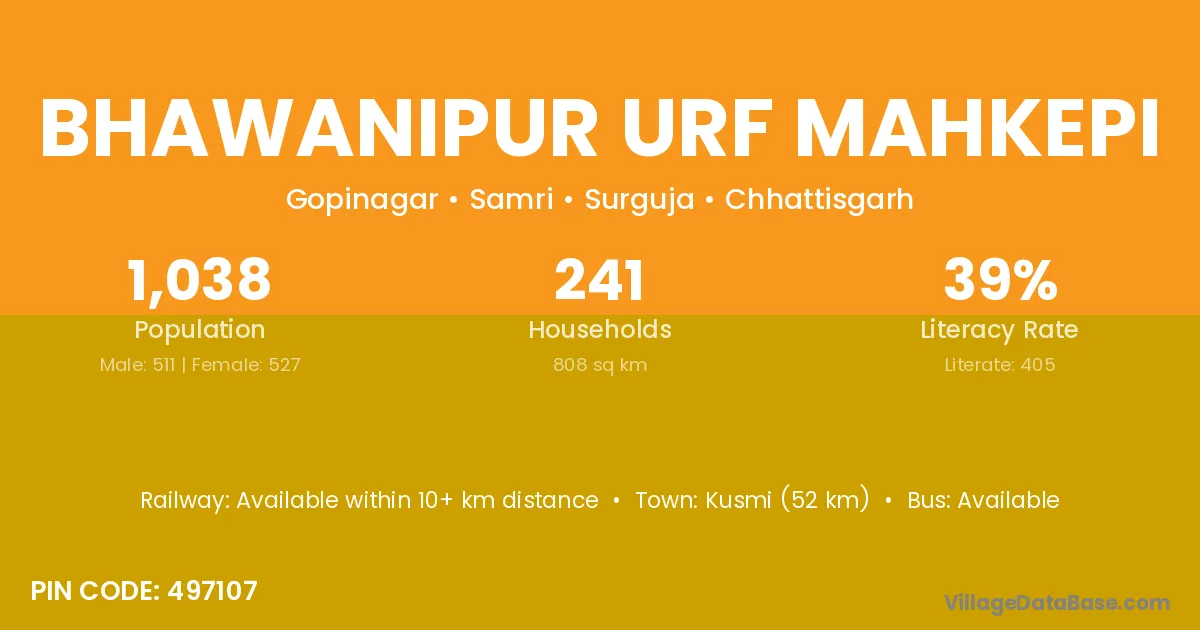 Bhawanipur Urf Mahkepi village is located in the Samri Tehsil of the Surguja district in Chhattisgarh .
