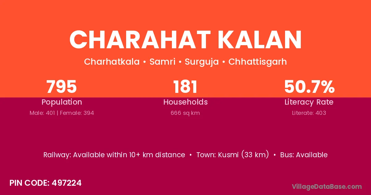 Kusmi (33 km) is the nearest town to Charahat Kalan village for major economic activities and is located approximately 33 km away.