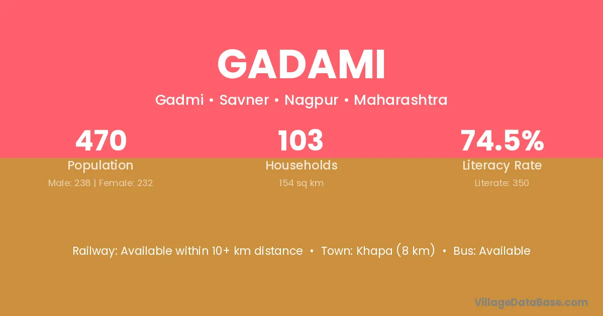Kusmi (40 km) is the nearest town to Gadami village for major economic activities and is located approximately 40 km away.