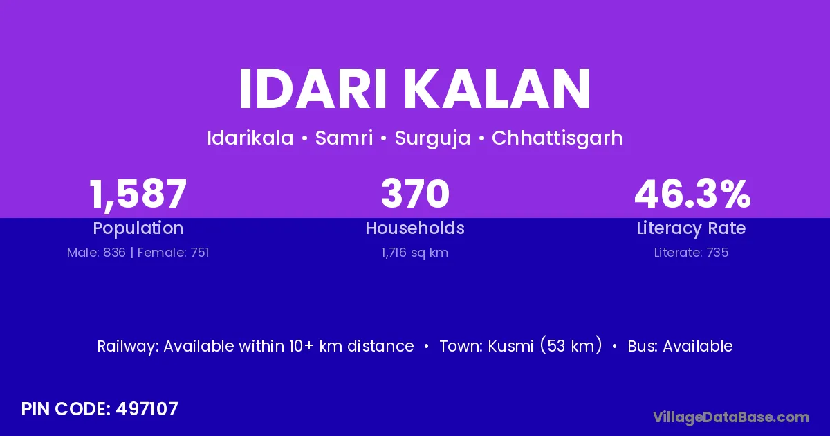 Kusmi (53 km) is the nearest town to Idari Kalan village for major economic activities and is located approximately 53 km away.